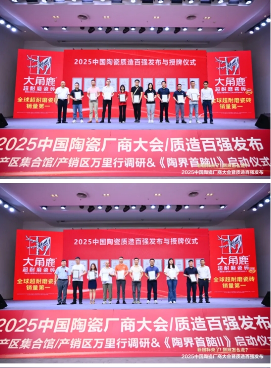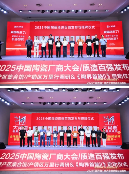 大商对话论坛 大商对话环节,来自华中销区、江西南昌的老龙严选图书馆创始人龙斌,湖北武汉的湖北辉哥优选供应链管理有限公司董事长陈朝辉,江西高安的江西良品建材有限公司董事长/CEO邹志良,来自西南销区、成都的吴氏美美家建材连锁总经理田泽勇,来自北方销区、山东淄博的鑫领峰集团董事长兼总经理郭峰,山东济宁的鲁粤陶瓷总经理段休磬,来自华南销区、广州的华陶董事总经理刘向,来自中原销区、郑州的玉玺建材有限公司总经理李书庆,他们各自分享了市场一线的真实反馈与渠道变革思路。本次大商对话由陶业时讯合伙人、主编丘利荣主持(更多精彩内容,敬请关注陶业时讯后期专题报道)。 作为对中国陶瓷坚守品质企业的致敬,大会隆重发布、授牌了“2025中国陶瓷质造百强” 榜单并进行了授牌仪式,这些行业头部企业、产区实力企业入选: