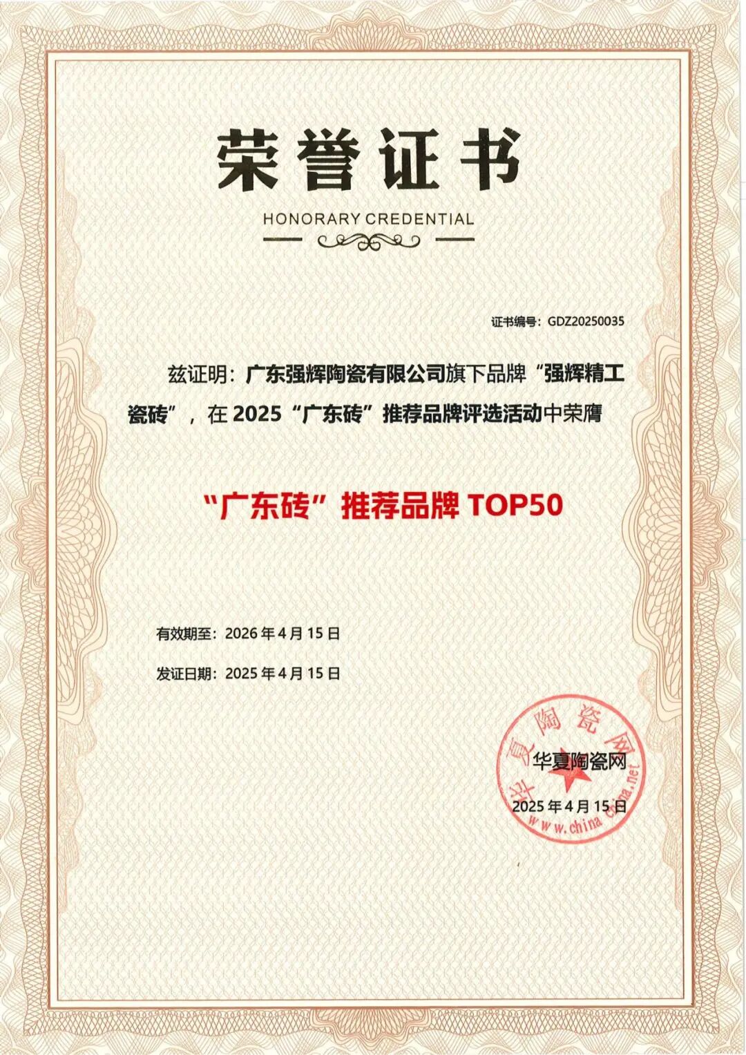 4 月 ,强辉精工瓷砖凭借综合实力与创新力入选 2025 “广东砖” 推荐品牌 TOP50 榜单。