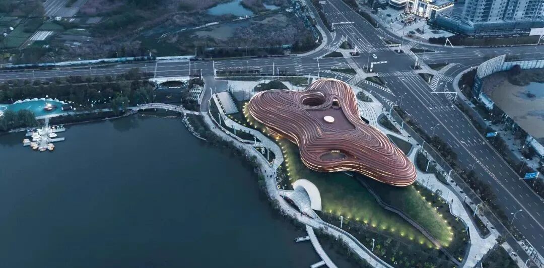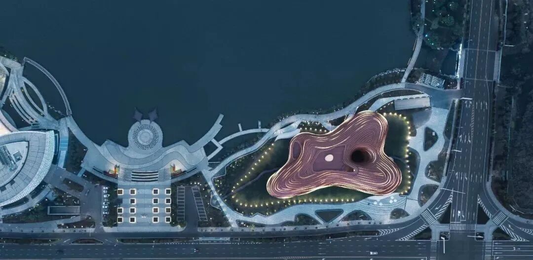 溧阳博物馆位于城市新区燕湖公园西南角,作为城市地标性的公共建筑, 介于湖水与城市之间,博物馆的设计灵感取自出自溧阳的“焦尾琴”,建筑师林琮然重构了形式上的象征感,试图在多面向的空间中融入典故的寓意,让建筑和自然与城市发生联系,创造出有机的型态与起伏的山体,营造一种开放自由的氛围,自然而然形成东方的山水诗意。谱写出一段悠扬在山林间的千古悬歌,自然而然形成一种藏巧于拙的意趣。