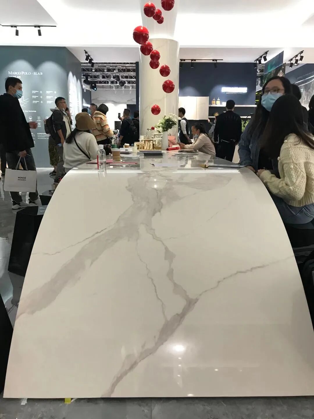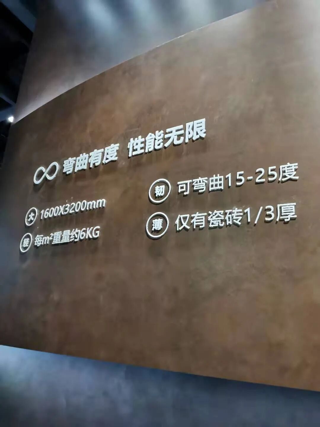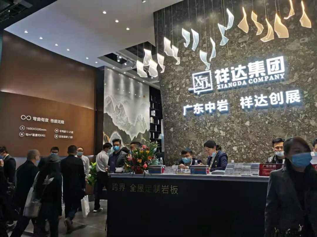 广东中岩以“全岩家居定制健康家”为主题,重点展示3mm超薄超大岩板的应用,该产品具有薄、轻、韧三种特性,打破了以往岩板的曲面应用难题,以其超强韧性、最高可弯曲40度,迎合了建筑外立面、内饰面,以及家具应用的弧形结构要求。