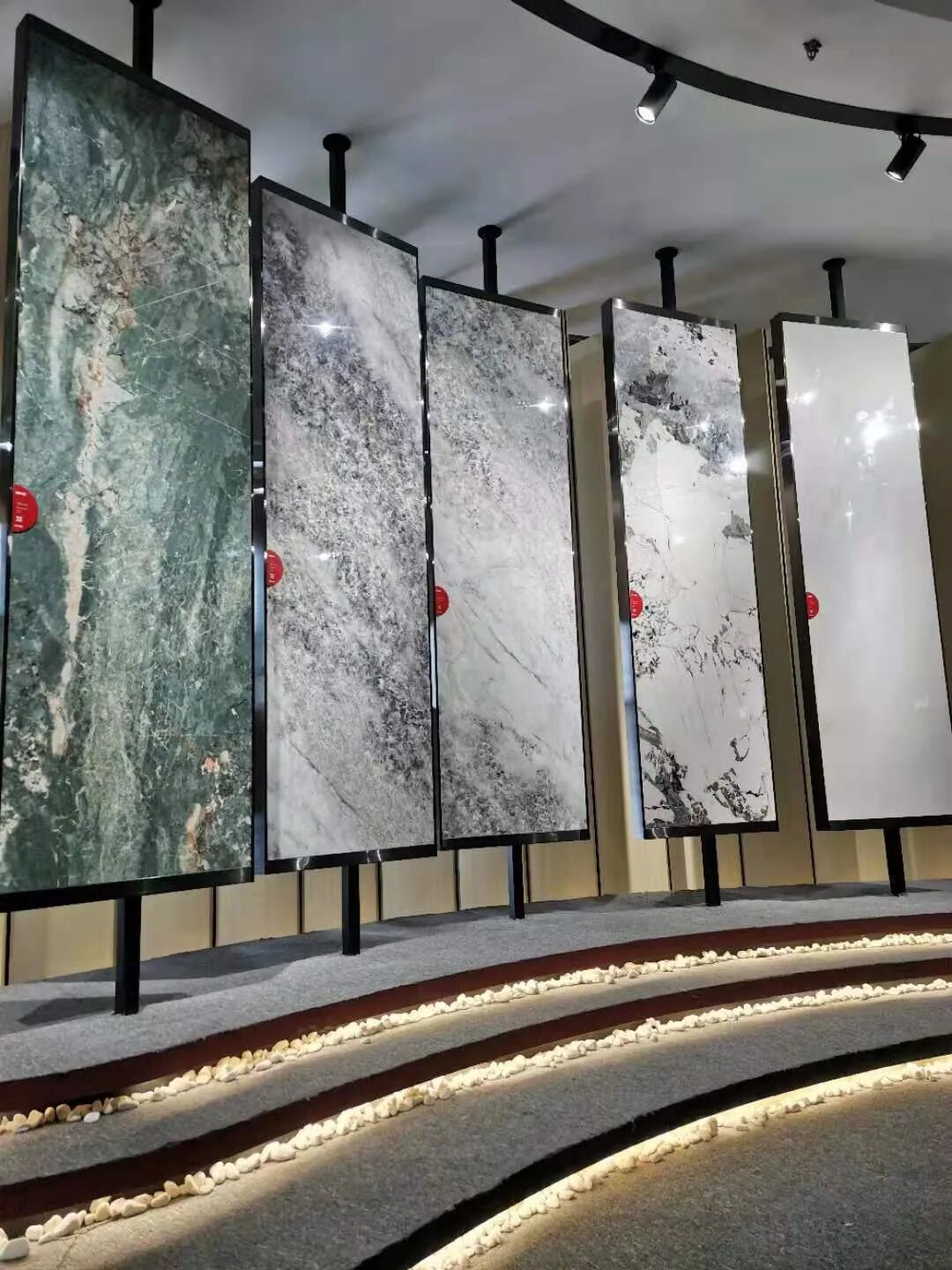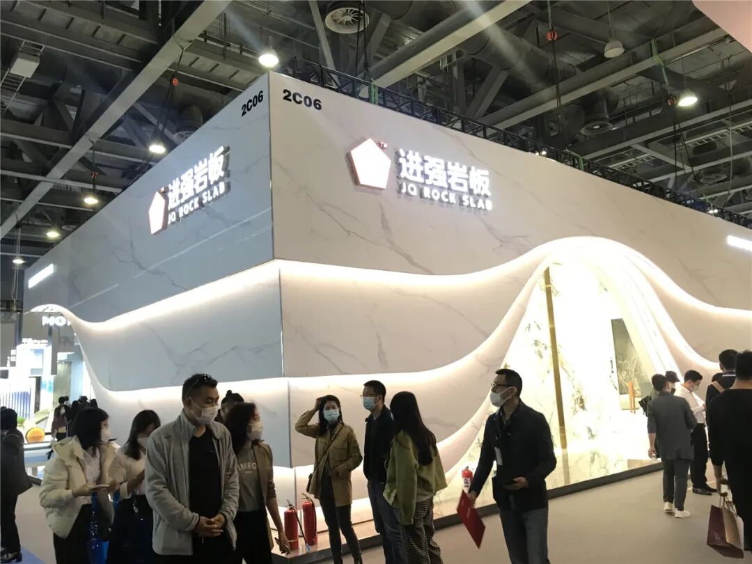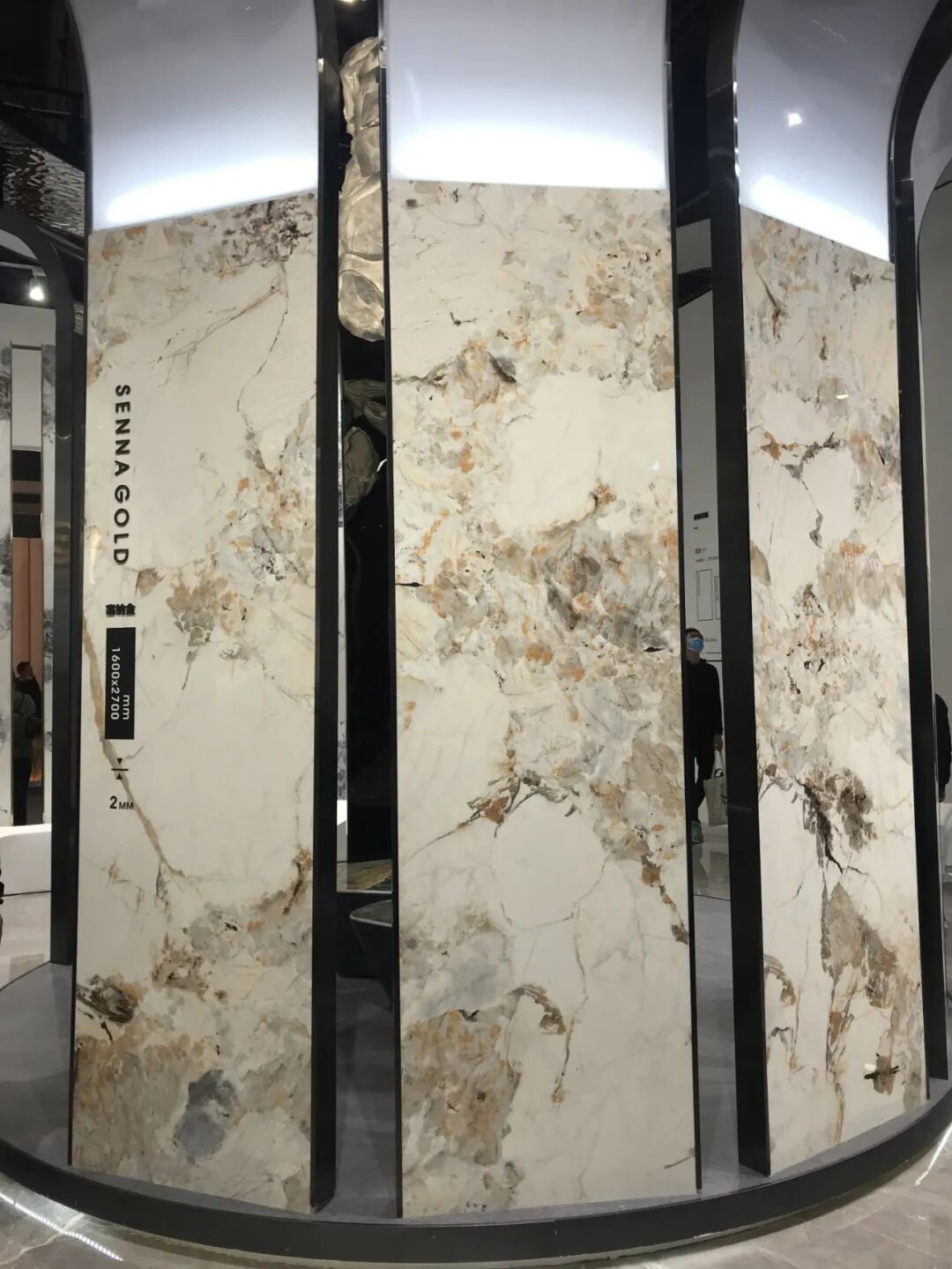 广东中岩以“全岩家居定制健康家”为主题,重点展示3mm超薄超大岩板的应用,该产品具有薄、轻、韧三种特性,打破了以往岩板的曲面应用难题,以其超强韧性、最高可弯曲40度,迎合了建筑外立面、内饰面,以及家具应用的弧形结构要求。