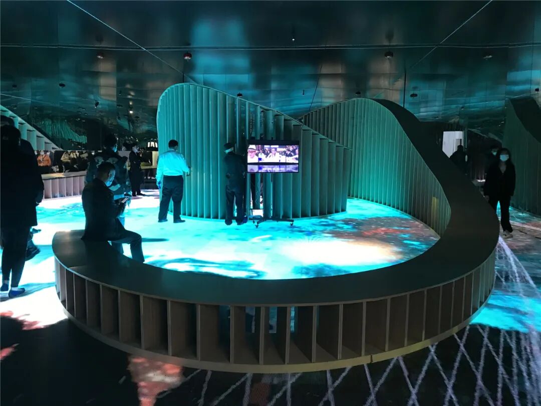 进强岩板展馆以「岩梦」为主题,主要展示了1600x2700mm、1600x3200mm的岩板。展馆利用沉浸式实景展现形式,将片状岩石植根于空间之中,运用大量理石纹理元素,呈现城市与自然多元融合的设计效果。
