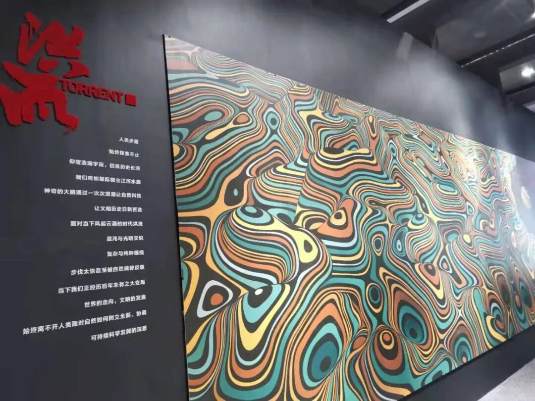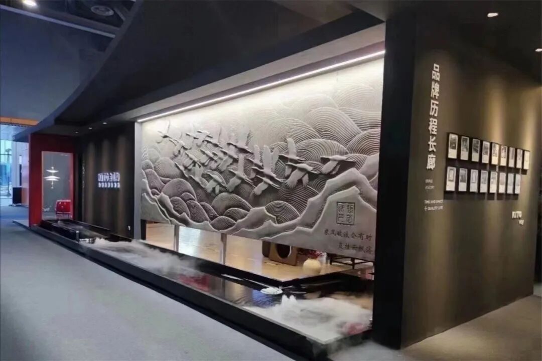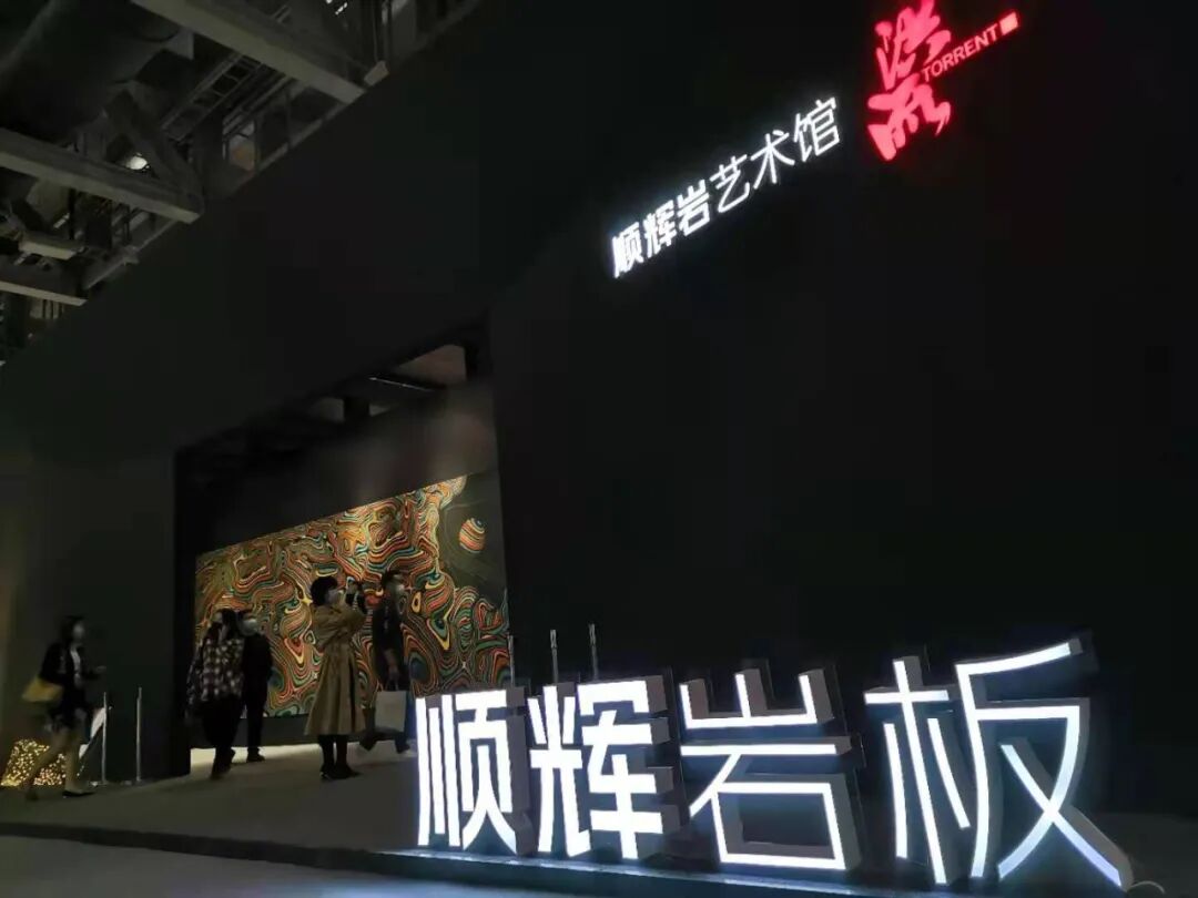 顺辉岩板展位以适应国际流行趋势的博物馆形式,通过声、光、电与岩板的创作结合,再现中国文化艺术的蓬勃发展。籍着广州设计周的契机,顺辉岩板联合中国非物质文化遗产项目、铜凿剪纸艺术家陈健珊女士以二次烧结工艺为基底,融合立体复合材料,共同创作“洪流”为主题的艺术壁画。此外,顺辉岩板携手顶级产品设计师、漆陶艺术家打造的以传统文化为创作元素的“大漆系列”,在本次展览上首次公开亮相。