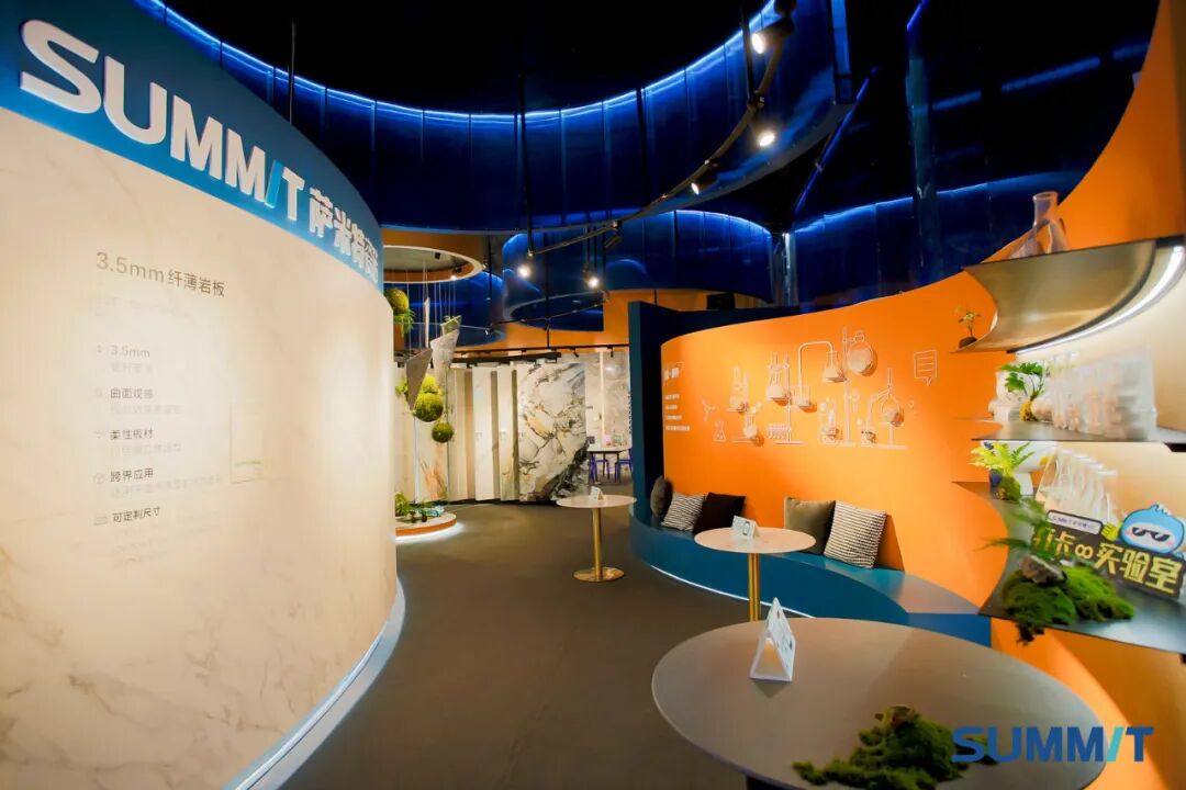 将军岩板打造“造物”概念馆,通过沉浸式体验,展现岩板的百变空间。展位设计理念源于“万物皆可”的概念,展位整体结构形状呈“圆形”,传递岩板的应用不仅限于建陶家居行业,还可以贯穿生活的全部。