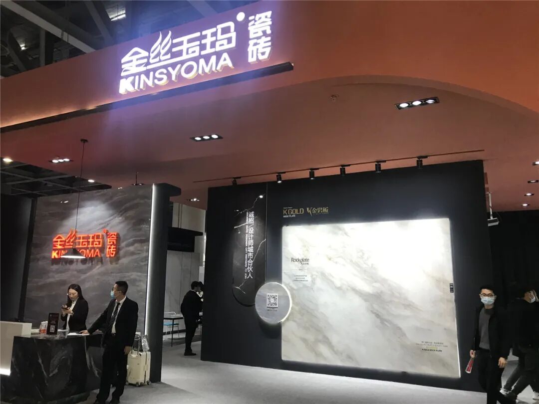 金丝玉玛瓷砖展馆以亮眼的酒红色为主色调,采用柔线造型设计,打造一个集艺术、自然、与生活的多维融合空间。本次金丝玉玛展示的K金岩板新品,突破行业常规岩板的工艺边界,创新性运用多种核心独创工艺相互叠加,电光釉+闪光粉+金元素完美融合,同时还突破性的融入荧光粉,以表面纹理为脉络顺向延伸,使产品更具动感和层次感。