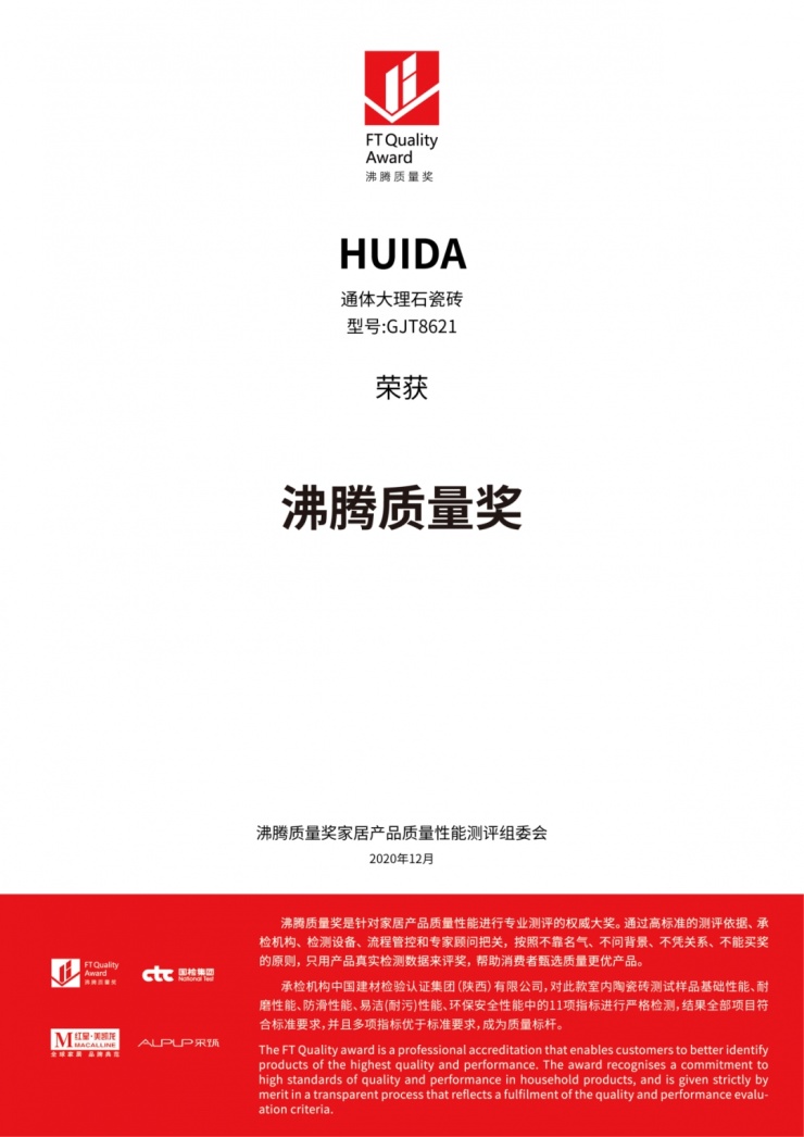 沸腾质量奖有着家居行业质量“奥斯卡”之称,专业度和权威性备受行业和市场认可。2020年度的评测包含13大家居品类,吸引了195家品牌参与,在经过11家专业检测机构长达一年的专业、客观评测后得出结果。本次评测中,惠达瓷砖珍石材系列GJT8621荣获沸腾质量奖。