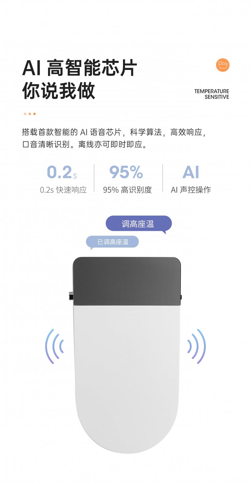 浪鲸声灵智能声控座便器搭载首款智能的AI语音芯片,通过科学算法高效响应,能达到0.2秒快速响应,95%高识别度,即使离线亦可即时响应。无论翻圈翻盖、冲水、调节温度等等,都能轻松完成语音指令,真正的彻底解放双手,愉悦享受生活。
