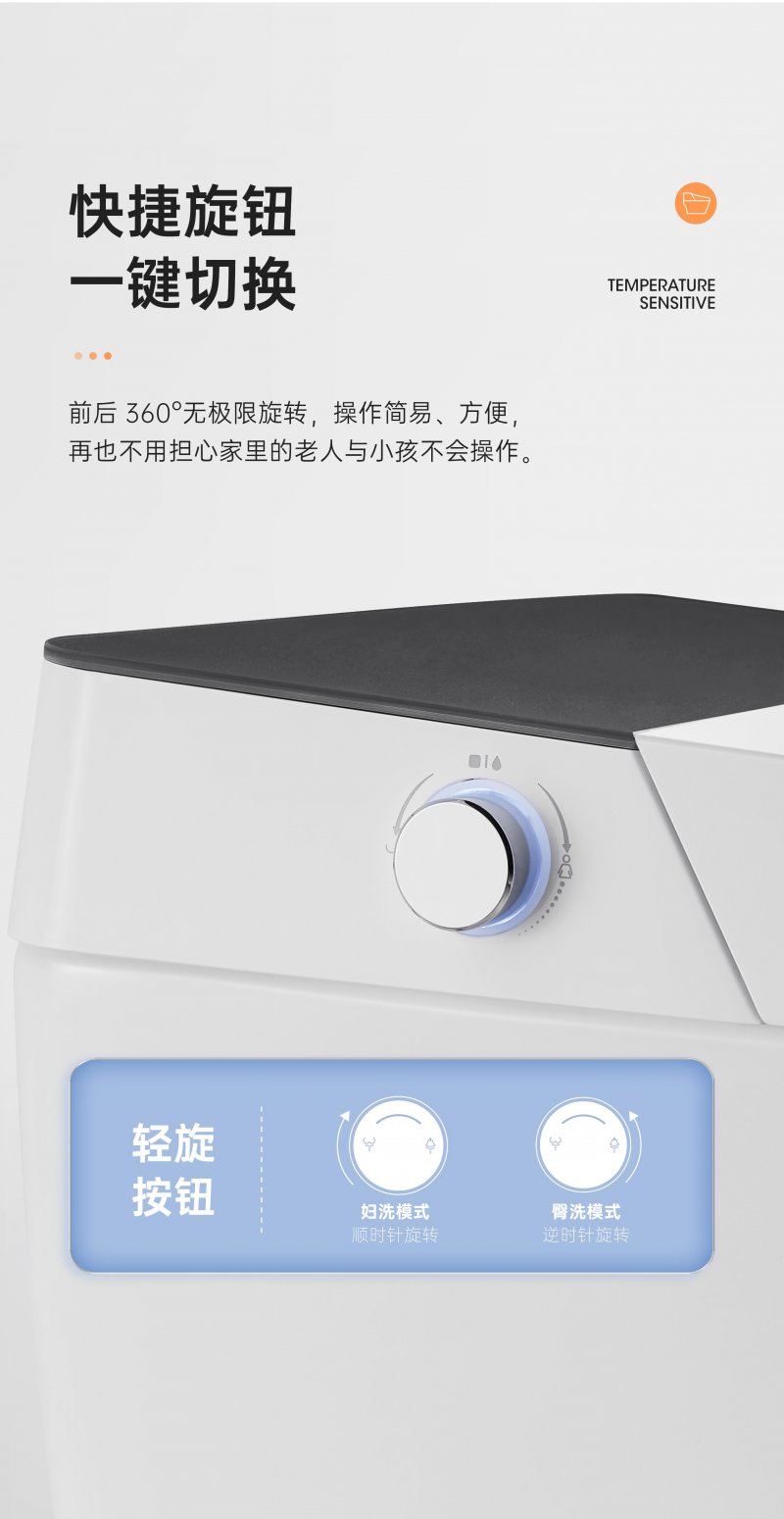 为了更方便家中的老人和小孩使用,浪鲸声灵还搭载了便捷按钮,前后360°无极限旋钮,向前为妇洗模式,向后为臀洗模式,操作简单便捷,再也不用担心老人和小孩不会操作,同样可以轻松享受舒适。