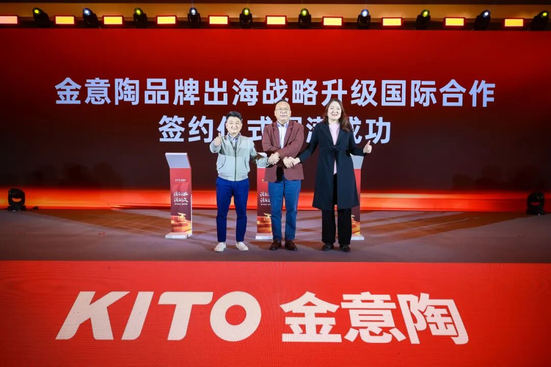 金意陶不仅向内夯实根基,更向外擘画了全球化发展新蓝图。会上,金意陶集团董事长何乾与阿联酋战略合作伙伴 VIDO SPACE CEO王骞、沙特阿拉伯战略合作伙伴 DSCC CEO路璐正式签署战略合作协议。在国内国际双循环的新发展格局下,金意陶正以领军者之姿,参与全球产业链的竞争,进一步提升国际竞争力,推动陶瓷行业的创新发展。