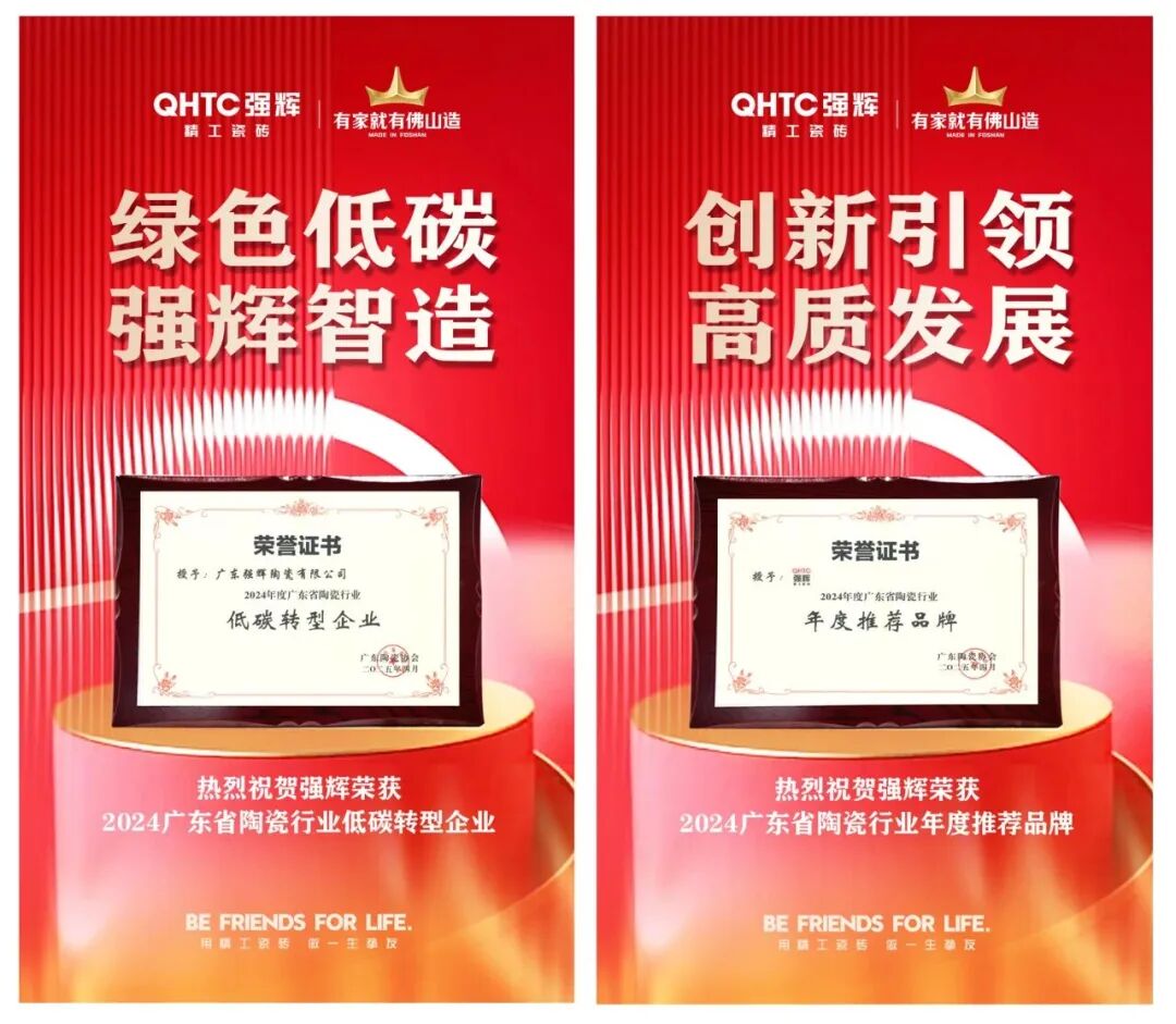 强辉精工瓷砖在 2025 年广东省陶瓷行业年会上,斩获 “低碳转型企业”、“年度推荐品牌” 两项荣誉。