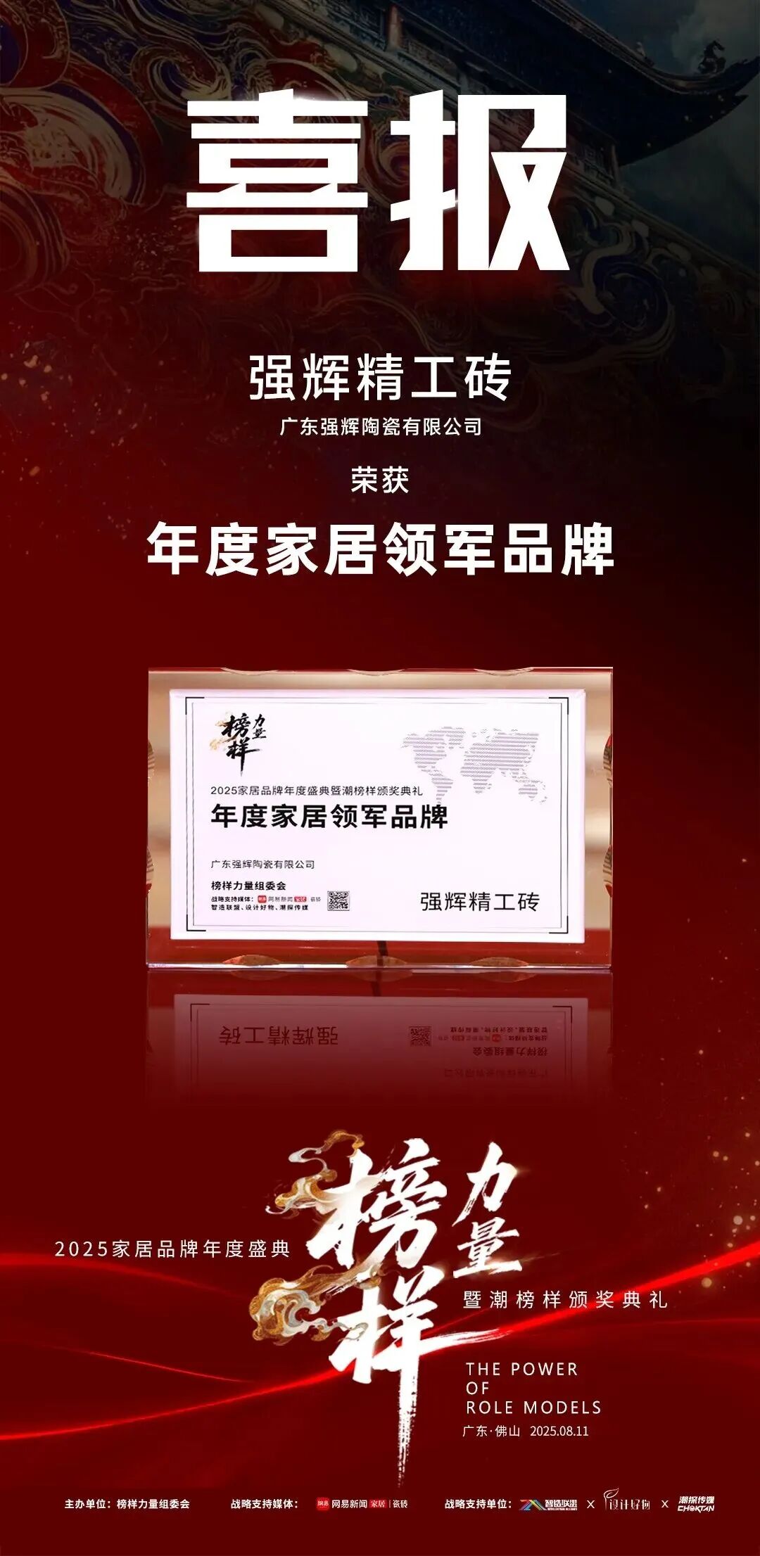 8 月 ,强辉在第五届《榜样力量》家居品牌年度盛典斩获 “2025 年度家居领军品牌” 殊荣。