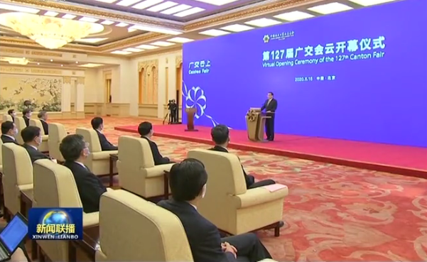 2020年6月15日,中共中央政治局常委、国务院总理李克强在北京人民大会堂出席第127届广交会云开幕式。受新冠肺炎疫情影响,本届广交会创新方式,改在网上举办。海内外近2.6万家企业参展。